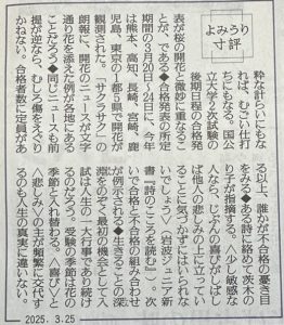「粋な計らいにもなれば、むごい仕打ちにもなる。国公立大学2次試験の後期日程の合格発表が桜の開花と微妙に重なることが、である。『サクラサク』の朗報に、開花のニュースが文字通り花を添えた例が各地にあることだろう。同じニュースも前提が逆ならむしろ傷をえぐりかねない。合格者数に定員がある以上、誰かが不合格の憂き目を見る。ある詩に絡めて茨木のり子が指摘する。<少し敏感な人なら、自分の喜びがしばしば他人の悲しみの上に立っていることに気づかずにはいられないでしょう>受験の季節は花の季節と入れ替わる。<喜び>と<悲しみ>の主が頻繁に交代するのも人生の真実に違いない。」