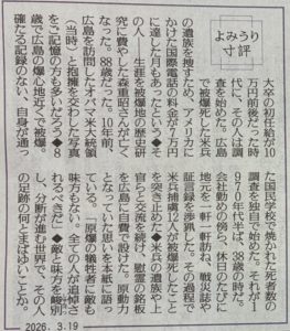 昨日(2026年3月19日)の読売新聞夕刊「よみうり寸評」に、2016年5月27日にオバマ大統領が米国大統領として初めて被爆地・広島を訪れ、平和記念資料館(原爆資料館)を視察、原爆死没者慰霊碑で献花した際に被爆者を代表され彼と抱擁を交わした森重昭さんが88歳で亡くなったことを伝える記事がありました。