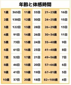 その後、その件についていろいろ調べ、これが「ジャネーの法則」という、「ある時期における時間の心理的長さは年齢に反比例する。例えば、50歳の人の1年間の長さは人生の50分の1であるが、5歳の人間にとっては5分の1となる。」という科学的な研究結果として存在している内容であるということを知り、ブログ記事にしました。
